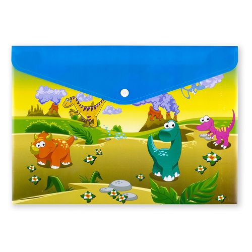 Aplankas pagamintas iš aukštos kokybės spalvoto plastiko, voko formos, su tvirtai užsegamu spaustuku. Su dinozaurų piešiniais, todėl labiau tinkamas naudojimui mokiniams. Plastiko storis 0.18 mm.