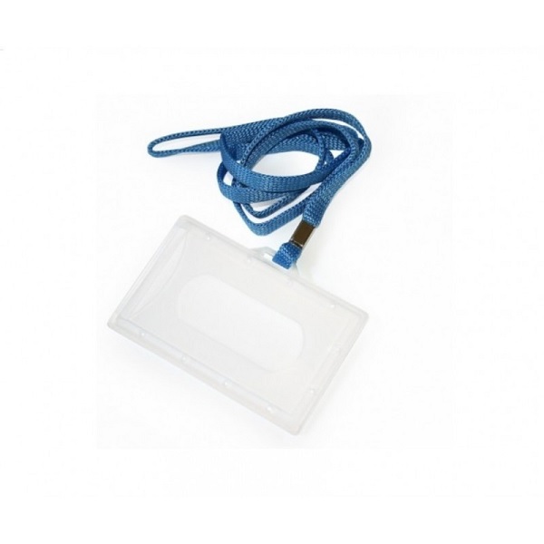 Horizontalus kieto plastiko dėklas skirtas asmens kortelei laikyti ir nešioti su prisegama juostele ant kaklo.