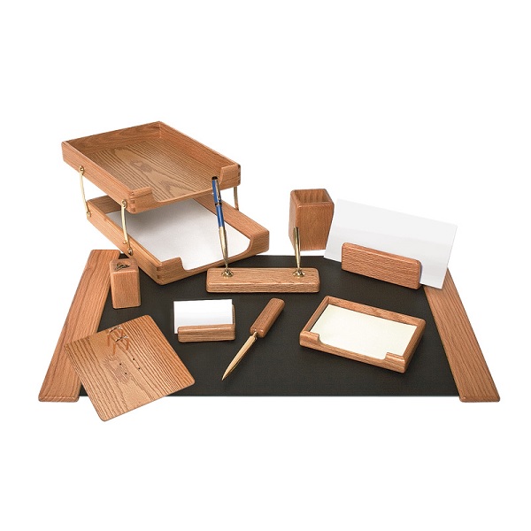 Elegantiškas ir prabangus darbo stalo rinkinys iš medžio su auksinės spalvos apdaila. Rinkinį sudaro: dviejų dalių padėklai dokumentams, vizitinės kortelės stovelis, sąvaržėlių dėžutė, peilis laiškams atidaryti, dėžutė užrašų lapeliams su lapeliais, padėklas – stovas dviems rašikliams, stovelis vartomam kalendoriui, pieštukinė, patiesalas, stovelis vokams.
