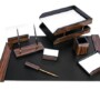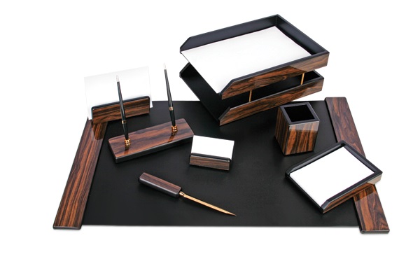 Elegantiškas ir prabangus darbo stalo rinkinys iš medžio su auksinės spalvos apdaila. Rinkinį sudaro: stalo patiesalas 66 x 42 cm, dviejų dalių padėklai dokumentams, vizitinės kortelės stovelis, pieštukinė, peilis laiškams atidaryti, dėžutė užrašų lapeliams su lapeliais, stovelis laiškams ir padėklas – stovas dviems rašikliams.
