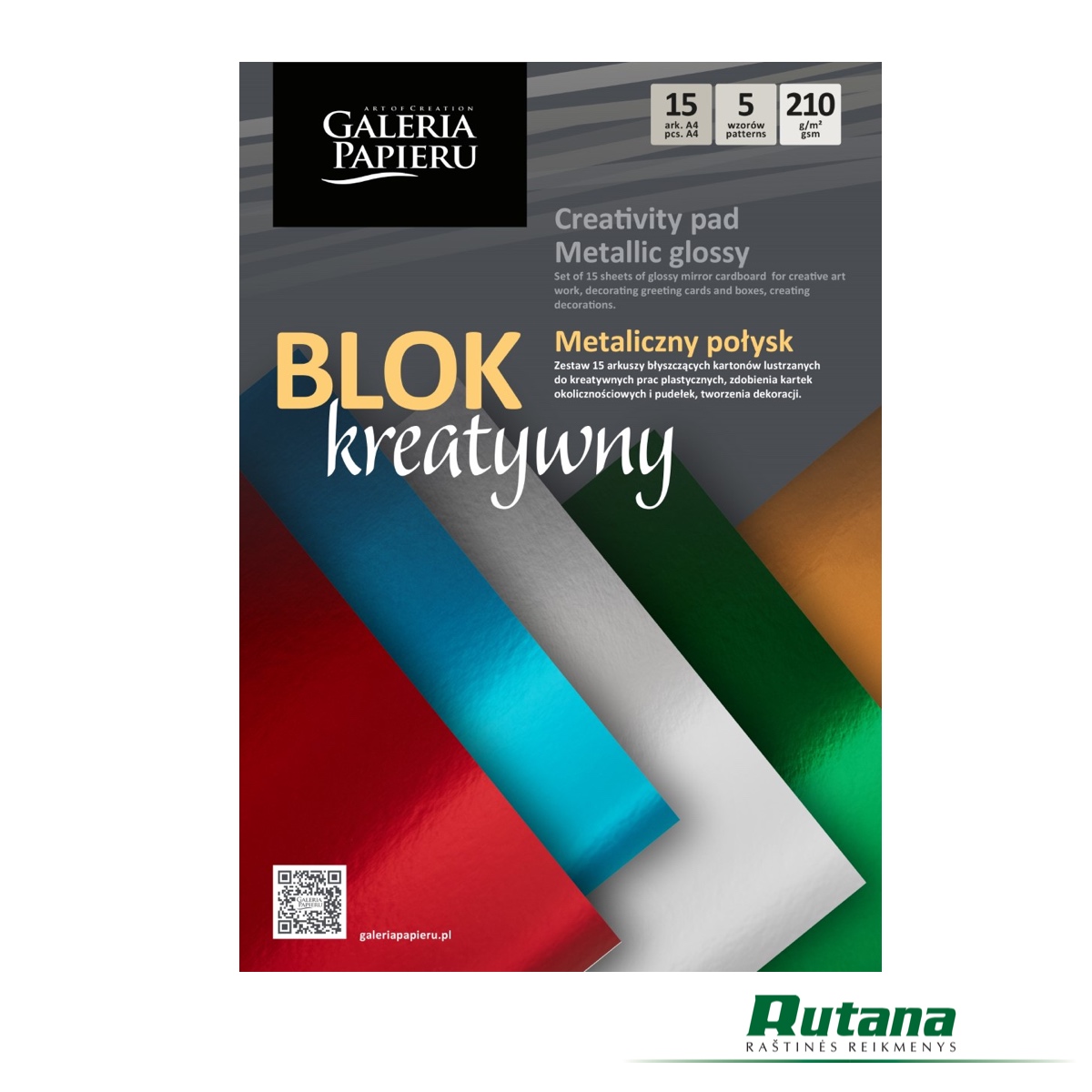 Popierius Metallic glossy – yra metalizuotas labai blizgus, storas popierius skirtas rankdarbiams, dekoracijoms ar dėžutėms gaminti. Šį Metallic glossy kūrybinį bloką sudaro 5 spalvų po 3 lapus popieriaus rinkinys. Metalizuotas popierius nėra skirtas spausdinimui.