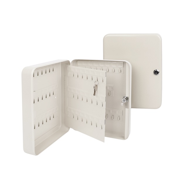 Metalinė dėžutė raktams su numeruotais kabliukais. Kabinama ant sienos. Rakinama.