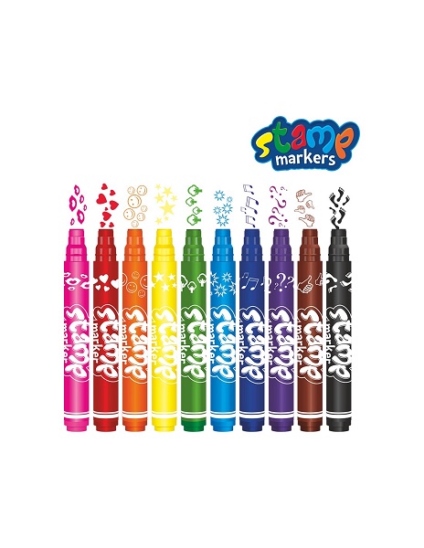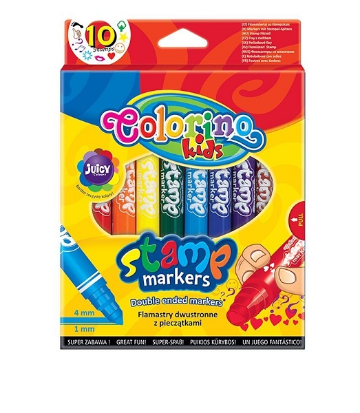 Dvipusiai flomasteriai: vienoje pusėje yra kūgio formos antgalis piešimui ir rašymui, kitoje – antspaudas. 10 ryškių spalvų – 10 skirtingų antspaudų.Idealiai tinka dekoruoti kvietimus, sveikinimo atvirukus.