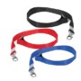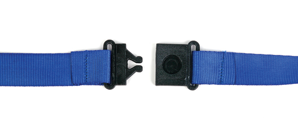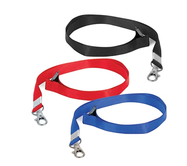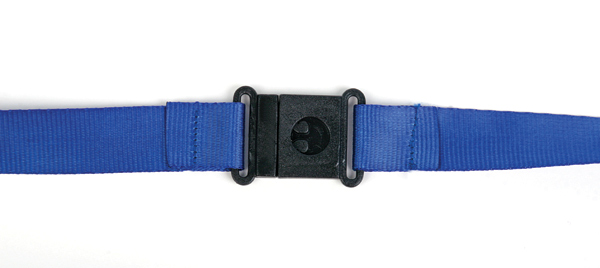 Medžiaginė juostelė su metaliniu spaustuku ir saugiu užsegimu iš plastiko, skirta vardinei kortelei arba dėklui.