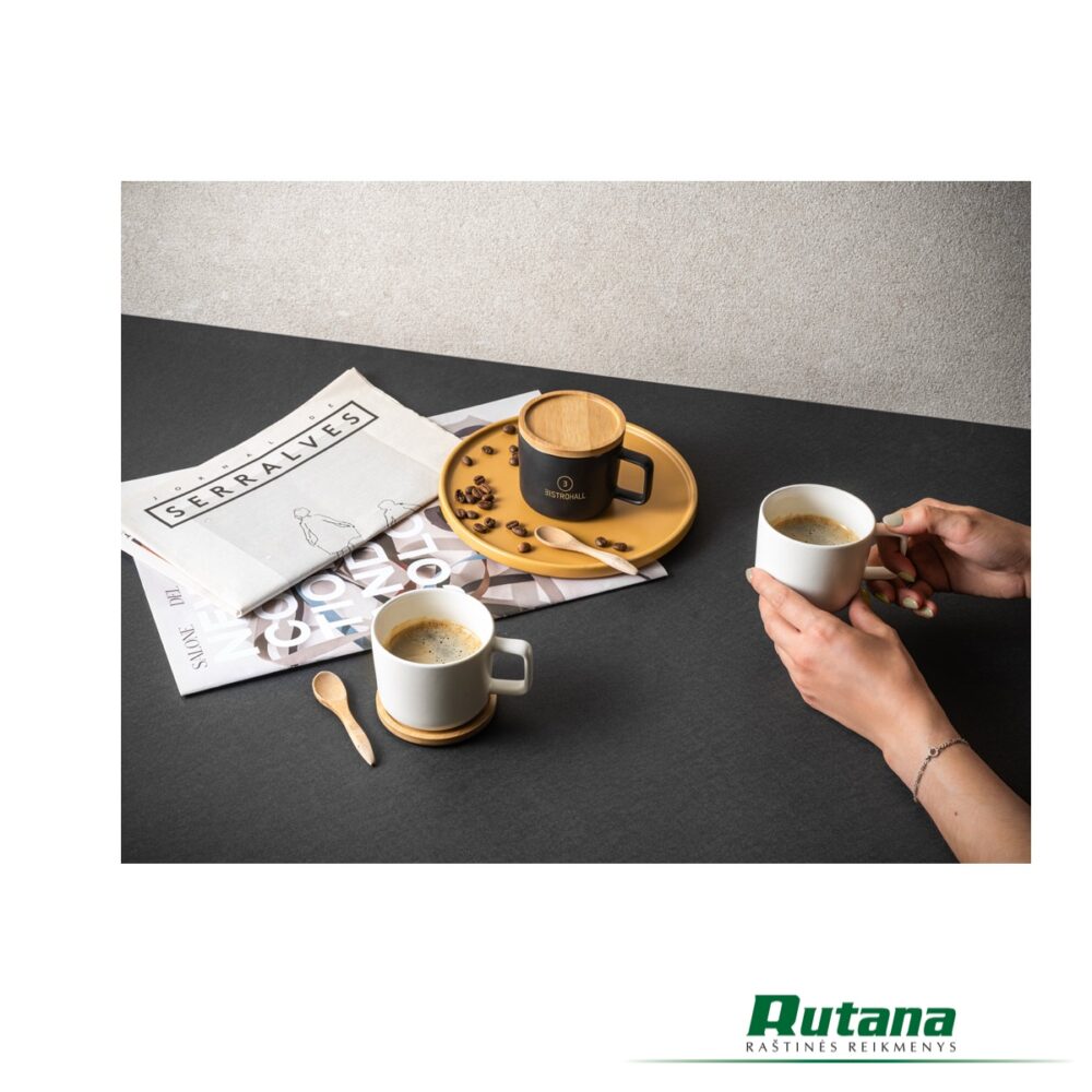 Užrašo uždėjimo galimos vietos: ant puodelio korpuso arba bambukinio pagrindo