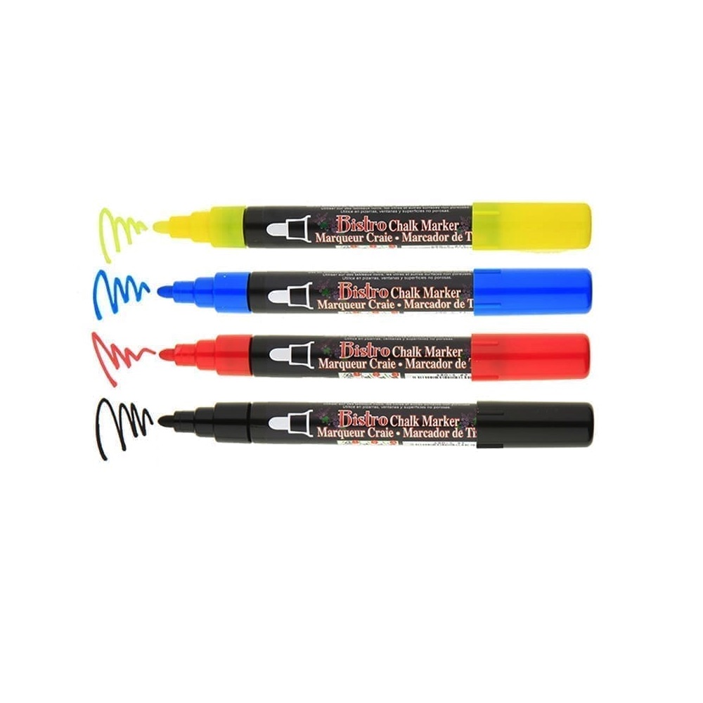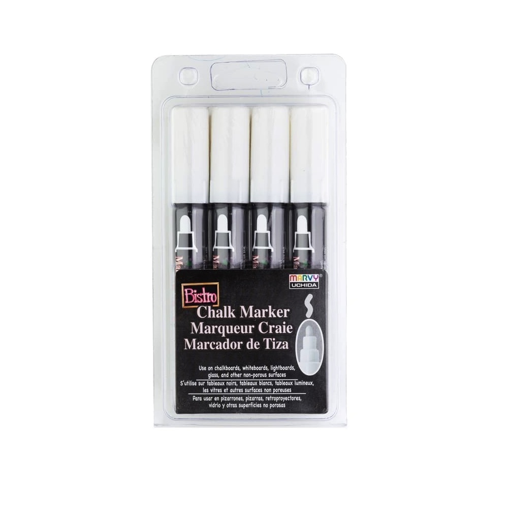 Kreidiniai markeriai Bistro Chalk Marker – tai geriausiai parduodamas MARVY UCHIDA produktas! Ypatinga šių markerių skystos kreidos rašalo formulė sukurta ir idealiai tinka kreidinių, prezentacinių lentų, švieslenčių, stiklo, langų ir bet kokių lygių paviršių ( ne akytų! ) dekoravimui. Netoksiški, sodrių ir ryškių spalvų ( nepermatomi ), vandens pagrindo markeriai greitai džiūsta, jais dekoruotus paviršius ir užrašus paprasta ir lengva valyti drėgna šluoste. Jūsų dekoracija išliks ryški iki kol nuspręsite ją nuvalyti. Šie markeriai – kaip tikra kreida!