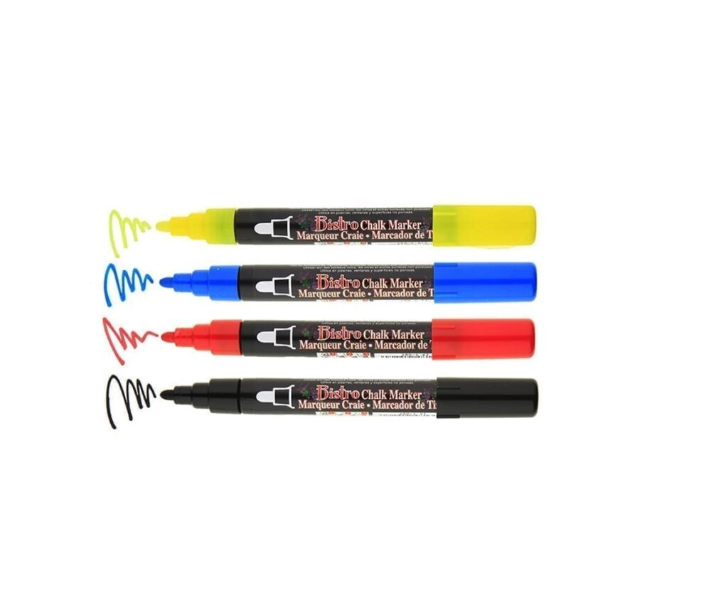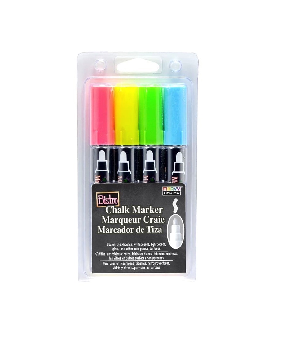 Kreidiniai markeriai Bistro Chalk Marker – tai geriausiai parduodamas MARVY UCHIDA produktas! Ypatinga šių markerių skystos kreidos rašalo formulė sukurta ir idealiai tinka kreidinių, prezentacinių lentų, švieslenčių, stiklo, langų ir bet kokių lygių paviršių ( ne akytų! ) dekoravimui. Netoksiški, sodrių ir ryškių spalvų ( nepermatomi ), vandens pagrindo markeriai greitai džiūsta, jais dekoruotus paviršius ir užrašus paprasta ir lengva valyti drėgna šluoste. Jūsų dekoracija išliks ryški iki kol nuspręsite ją nuvalyti. Šie markeriai – kaip tikra kreida!