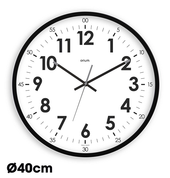 Analoginis laikrodis, baltas ciferblatas su juodos spalvos skaičiais ir minučių žymėjimu. Puikus įskaitymas ( 40 metrų atstumu ) dėl didelių juodų skaičių baltame fone. Kabinamas ant sienos. Puikiai tinkamas naudoti ligoninėje, mokykloje ar pan.