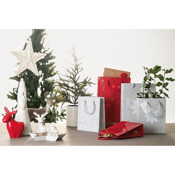 Maišelis iš dengto popieriaus su blizgia plastifikacija. Pagamintas iš kartoninio pagrindo, su kortele užrašui. Skirtas dovanų įteikimui ar gražiam įpakavimui.