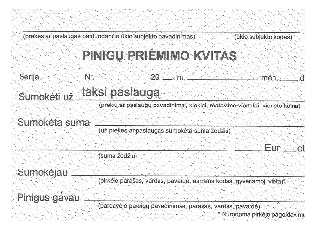 Pinigų priėmimo kvitai, pagaminti iš 2 – jų save kopijuojančių lapų, skirti taksi vairuotojams, išrašyti už suteiktas paslaugas. Kvitai be numeracijos.
