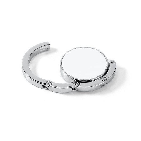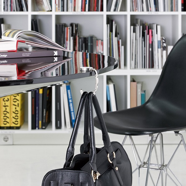 Metalinis laikiklis moteriškoms rankinėms, naudojamas prie stalo.