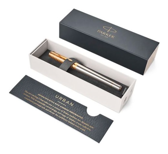 Išskirtinis stilius su puikiu atlikimu. Akį traukiantis „Urban“ perkelia per šimtmetį trukusią „Parker“ tradiciją į naują dinamišką teritoriją. Savo nepakartojamu lenktu dizainu ir apdailos asortimentu jis buvo sukurtas taip, kad pagirtų asmeninį stilių ir padidintų pasitikėjimą kiekvienu žodžiu. Rašiklis puikiai tinka graviruoti lazeriu, todėl šį rašiklį galite padovanoti kiekvienomis progomis, pavyzdžiui, kalėdine dovana ar bet kokiu jubiliejumi. Kiekviena įmonė gali iš to padaryti tikrai gražią „Parker“ dovaną darbuotojams ar reklamos tikslais. Pilka anoduota aliuminio medžiaga, kurią papildo modernus raštas, išgraviruotas nesenstančiais grafiniais tonais. Blizgus išgraviruotas aukso spalvos dangtelis. Papildyta auksinėmis PVD apdailomis. Supakuota į „Parker“ dovanų dėžutę. Rašikliui naudojama keičiama Parker šerdelė.