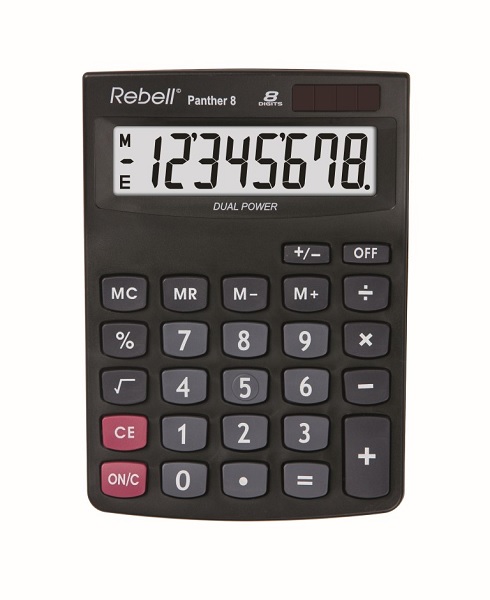 Stalinis skaičiuotuvas su pagrindinėmis matematinėmis skaičiavimo funkcijomis. 4 atminties mygtukai, procentų skaičiavimo funkcija, šaknies funkcija, antkainio funkcija. Kieti plastikiniai klavišai. Maitinimas saulės baterija ir elementais.