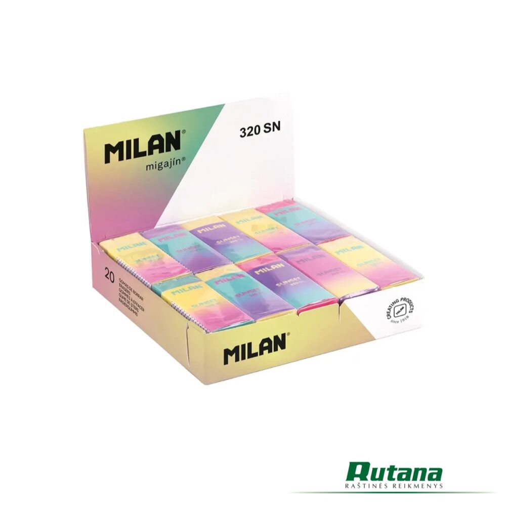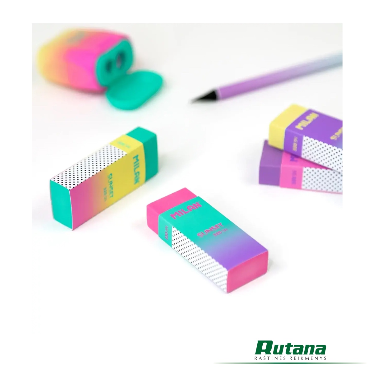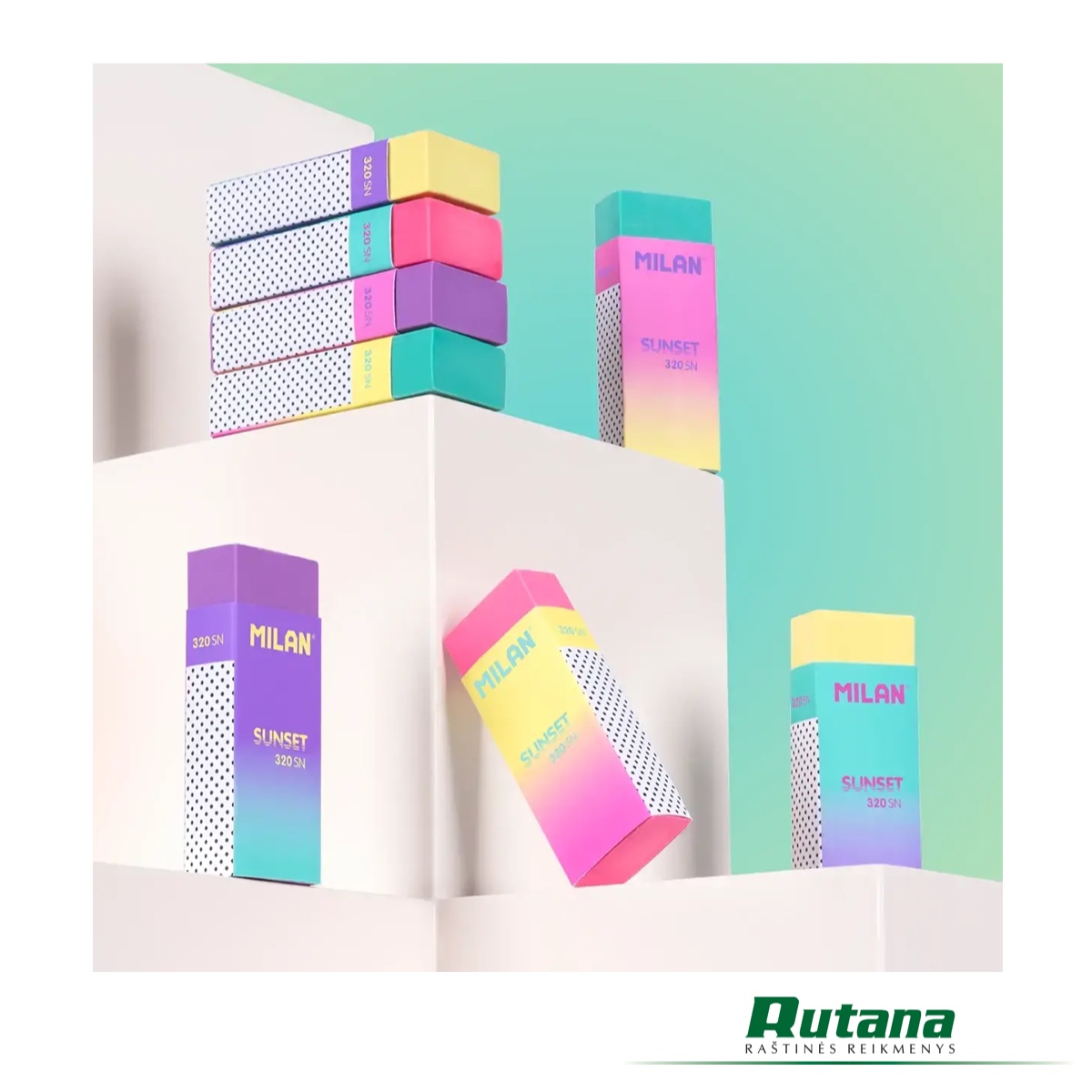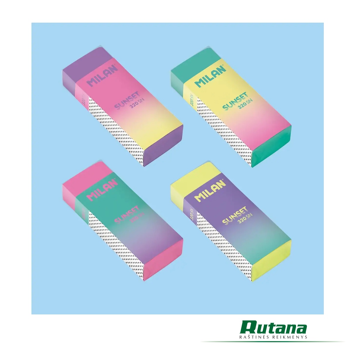 „Sunset“ serijos „nata® 320“ trintukas. Universalus, minkštas, nesibraižantis plastikinis trintukas. Pieštukui trinti nuo visų tipų paviršių. Su „Sunset“ kartonine įmaute, supakuotas atskirai. MILAN trintukai gaminami Ispanijoje nuo 1918 m.