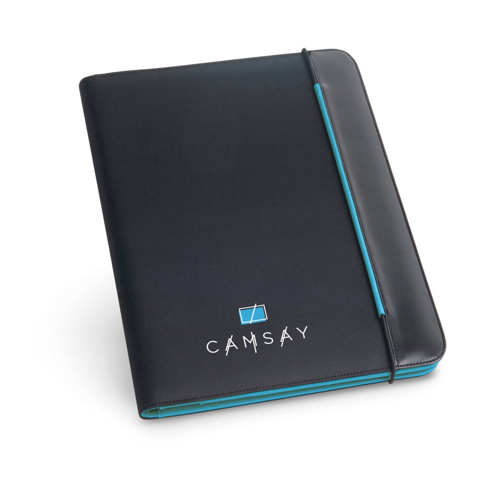 A4 formato aplankas iš PU ir 800D audinio su mikropluošto vidumi. Užsegimas tampria gumele. Sudėtyje yra 40 linijuotų puslapių bloknotas, 3 kišenės ir rašiklio laikiklis ( rašiklis nepridedamas ).