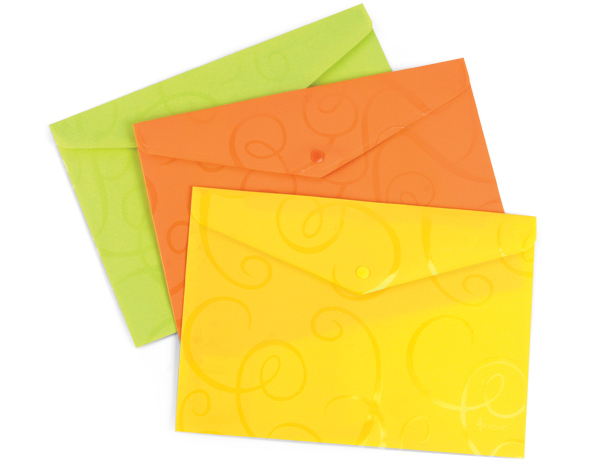 Plastikinis aplankas, voko formos, su tvirtai užsegamu spaustuku. Plastiko storis 0,18 mm. Telpa iki 80 lapų.