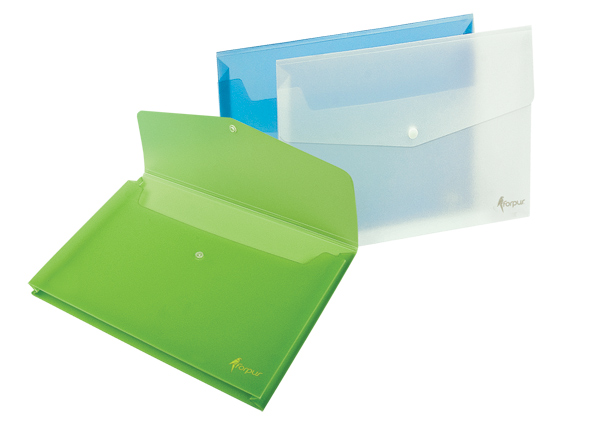 Aplankas pagamintas iš pusiau skaidraus spalvoto plastiko, voko formos, su tvirtai užsegamu spaustuku. Plastiko storis 0.35 mm. Telpa iki 150 lapų.
