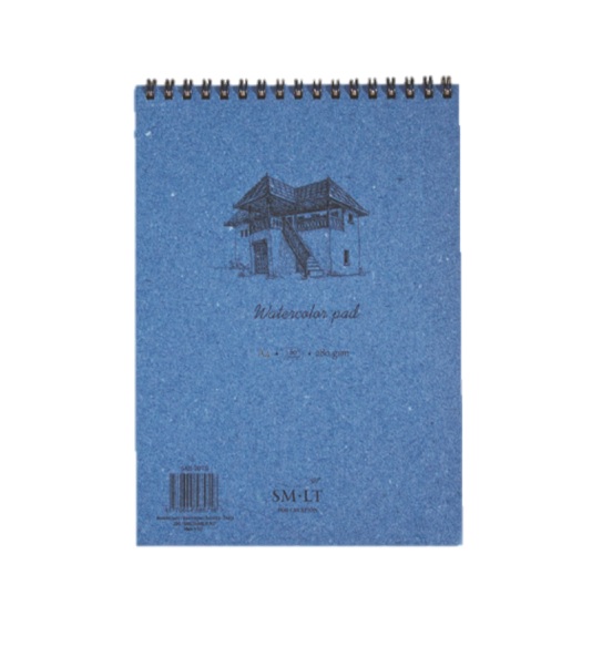 Bloknotas su baltu šiurkščiu akvareliniu popieriumi viduje. Natūralaus spalvoto kartono viršelis, kieta nugarėlė, mikroperforuoti lapai ir spiralė viršuje.