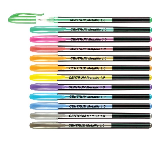 Gelio rašikliai, rašantys metaliko žvilgesiu ir spindesiu, juodos spalvos korpusas, kamštuko spalva atitinka rašymo spalvą. Rinkinyje 12 spalvų. Rašikliai supakuoti plastikiniame dėkle su užsegimu.