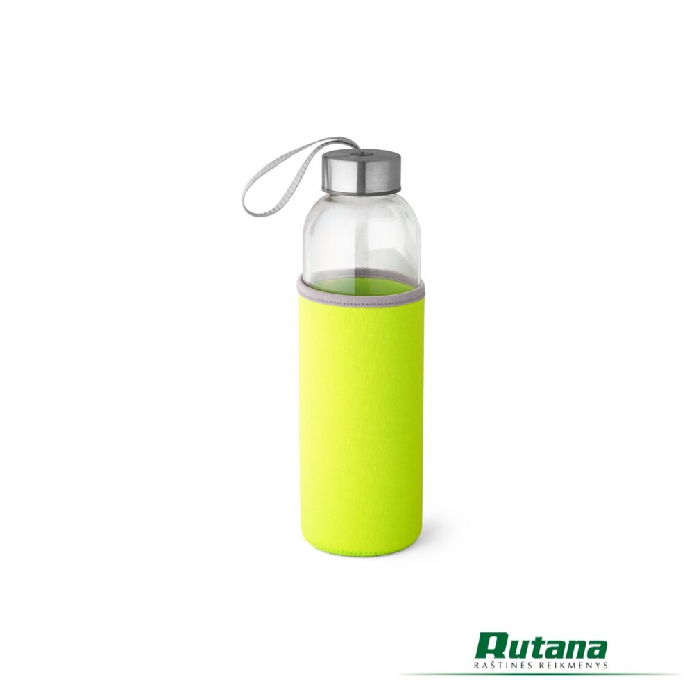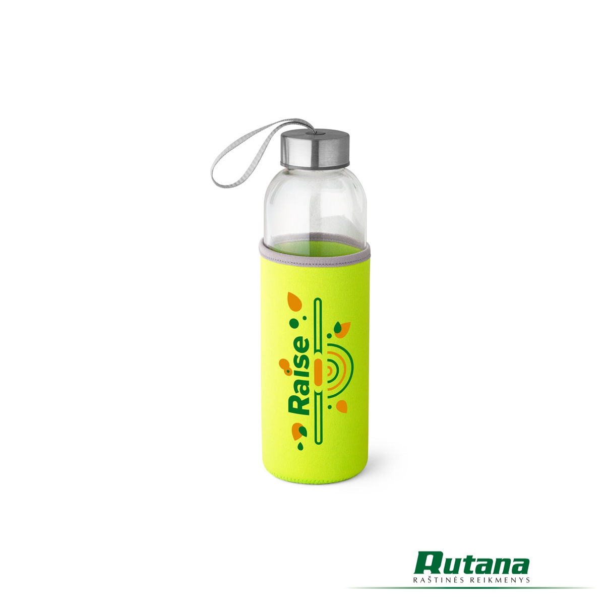 Stiklinis ir nerūdijančio plieno sportinis butelis su rankena ant užsukamo dangtelio, kad būtų lengva transportuoti. Tiekiamas su minkštu dėklu.