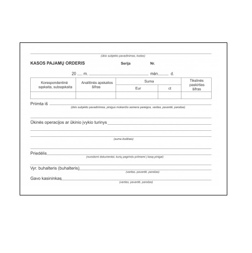 Kasos pajamų orderiai, pagaminti iš 2 – jų save kopijuojančių lapų. Orderiai be numeracijos.