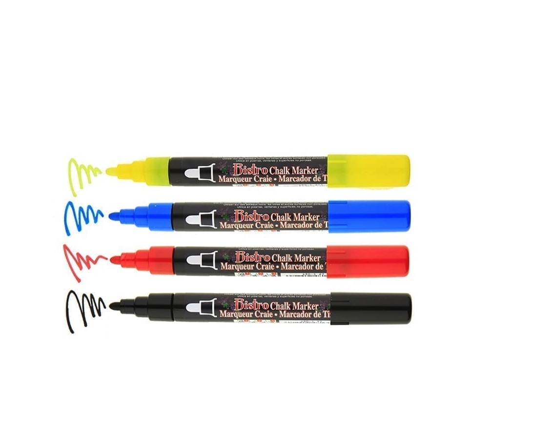 Kreidiniai markeriai Bistro Chalk Marker – tai geriausiai parduodamas MARVY UCHIDA produktas! Ypatinga šių markerių skystos kreidos rašalo formulė sukurta ir idealiai tinka kreidinių, prezentacinių lentų, švieslenčių, stiklo, langų ir bet kokių lygių paviršių ( ne akytų! ) dekoravimui. Netoksiški, sodrių ir ryškių spalvų ( nepermatomi ), vandens pagrindo markeriai greitai džiūsta, jais dekoruotus paviršius ir užrašus paprasta ir lengva valyti drėgna šluoste. Jūsų dekoracija išliks ryški iki kol nuspręsite ją nuvalyti. Šie markeriai – kaip tikra kreida!