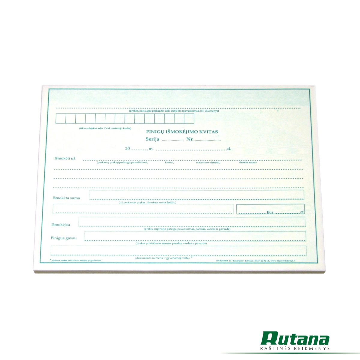Pinigų išmokėjimo kvitai A5 savekopijuojančių lapų klijuota pakuotė, kurioje yra 50 komplektų po 2 lapus. Kvitai yra be numeracijos.