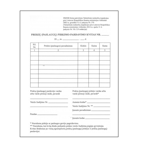Kvitai, pagaminti iš 2 – jų save kopijuojančių lapų, su kartoniniu viršeliu. Turi papildomą kartoninį atvartą, kurį galima naudoti kaip skirtuką. Kvitai be numeracijos.
