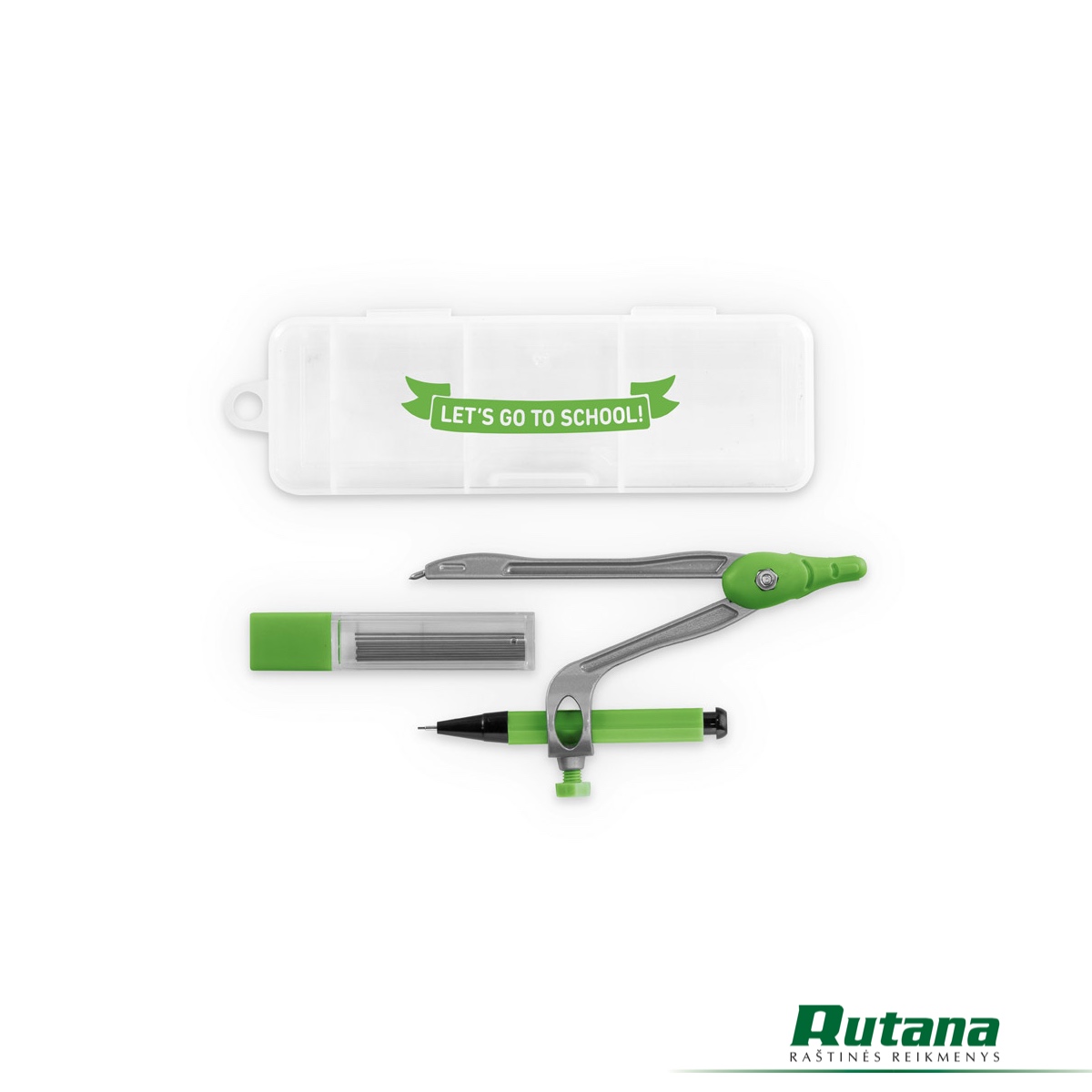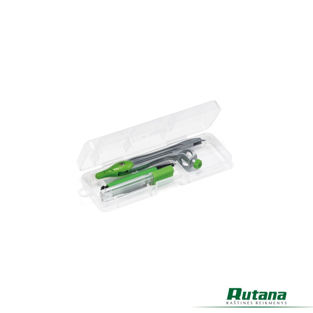 Geometrijos mokyklinis rinkinys PP dėkle. Rinkinį sudaro 1 skriestuvas, 1 mechaninis pieštukas ir 10 vnt. grafitinių šerdelių 0.5 mm storio.