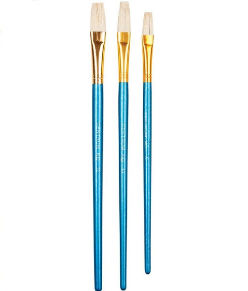 Teptukų rinkinys, kuriame plokščios formos teptukai skirti piešti guašu. Metalinė, iš aliuminio pagaminta apsauga yra atspari korozijai.