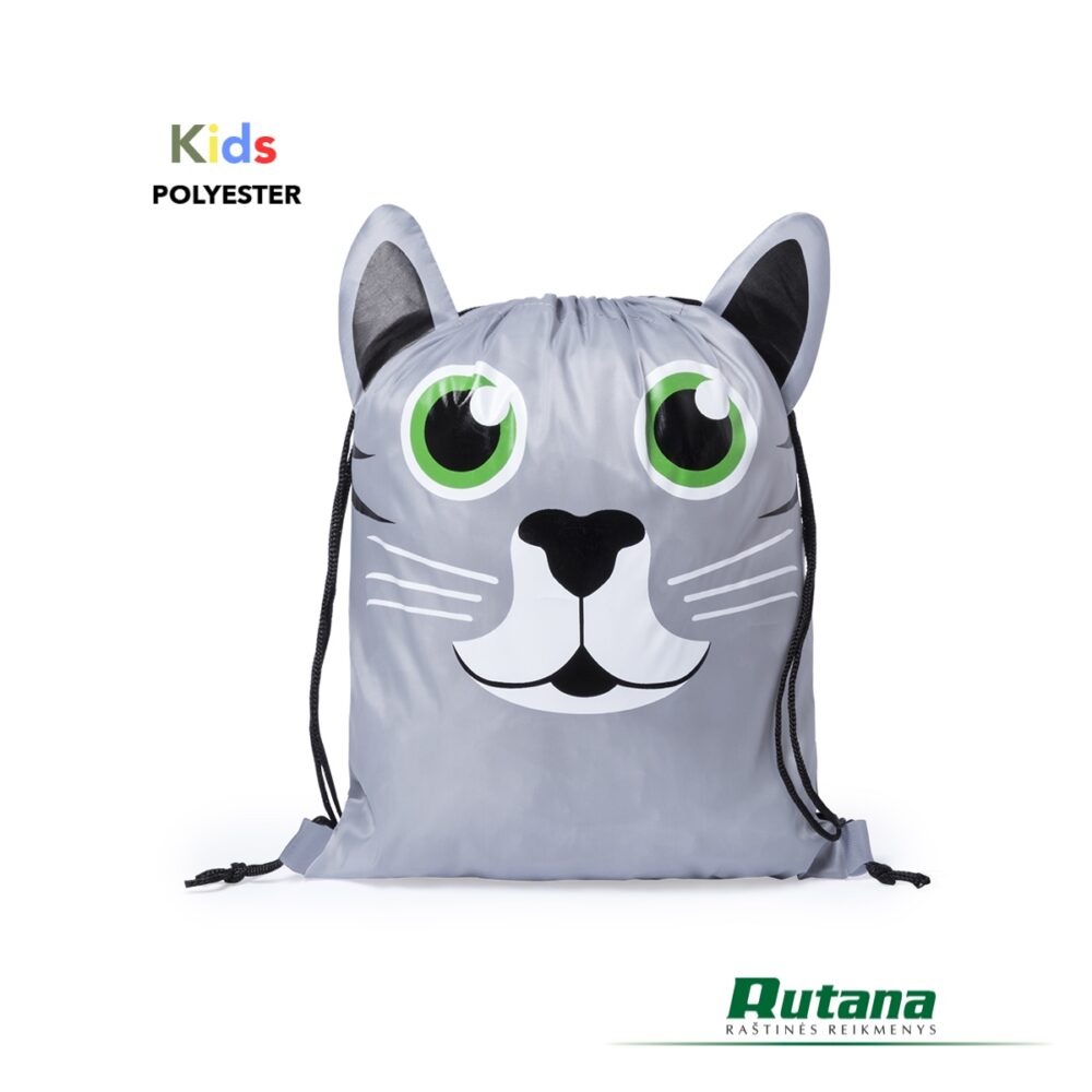 Vaikiška kuprinė su raišteliu, pagaminta iš minkšto poliesterio 210T su originaliais gyvūnų raštais. Su juodais užsisegančiais raišteliais ir sutvirtintais kampais. Patogiai sulankstoma.